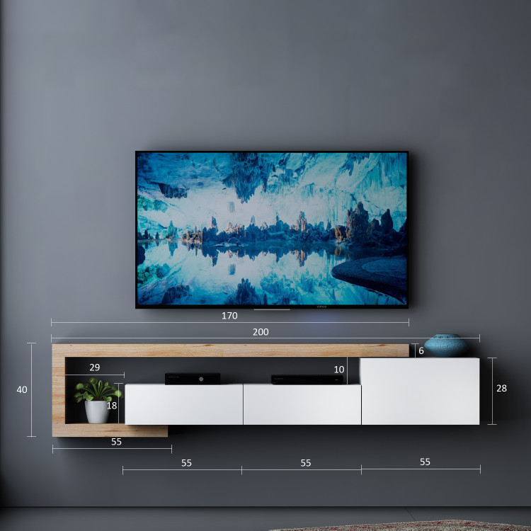 میز تلویزیون دیواری MDF الیسا (Elisa) از سه باکس دیواری و یک کلاف طرح چوب تشکیل شده است. باکسهای دربدار سفید رنگ که در تصویر مشاهده میکنید از جنس سفید هایگلاس مات ساخته شده و عمق آنها 35 سانتیمتر است که برای قرار دادن گیرنده دیجیتال و لوازم مشابه مناسب میباشد.یک باکس سفید سمت راست این میز تلویزیون دیواری بوسیله فشار دست و با کمک مگنت فشاری توکار و جک گازی باز و بسته میشود (جهت باز شدن درب از بالا به سمت پایین می باشد) و دو باکس سمت چپ به صورت کشو می باشند که توسط ریل تاچ (مگنتی) باز و بسته میشود.کلاف چوبی شکل دور کار از جنس ام دی اف (MDF)طرح چوب میباشد و عمق آن 22 سانتیمتر است که همانطور که در تصویر محصول مشاهده میکنید برای قرار دادن اشیا دکوری، DVD، کتاب و … مناسب است.